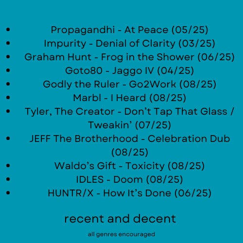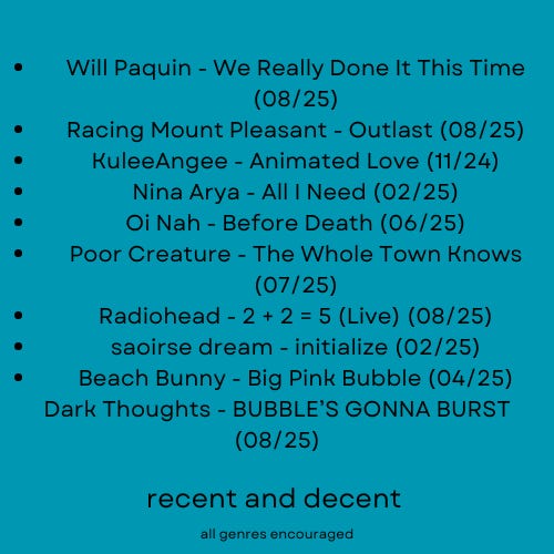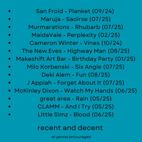 I just want to say a huge thank you for listening to my weekly Recent and Decent playlists. They continue to be the posts that are engaged with the most, and it’s probably the element of my Substacking personality that I’m most proud of. Please keep reading, listening and sharing and let’s keep the love of new music alive, burning like an raunchy ember of hope.